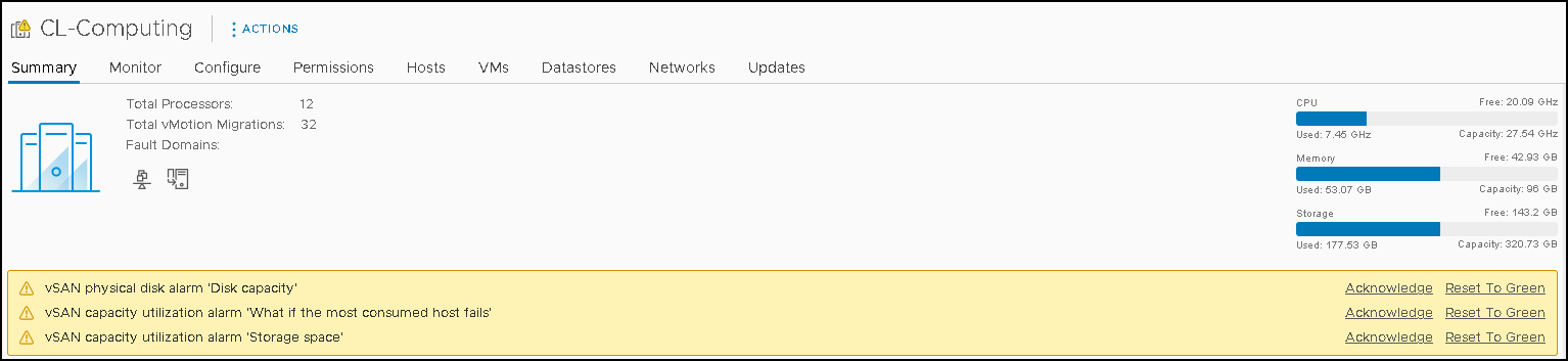 So, if you have a vSAN Cluster, you could receive some alerts related to the Storage Capacity, Disk Capacity, or Capacity Utilization, as we can see in the picture below: