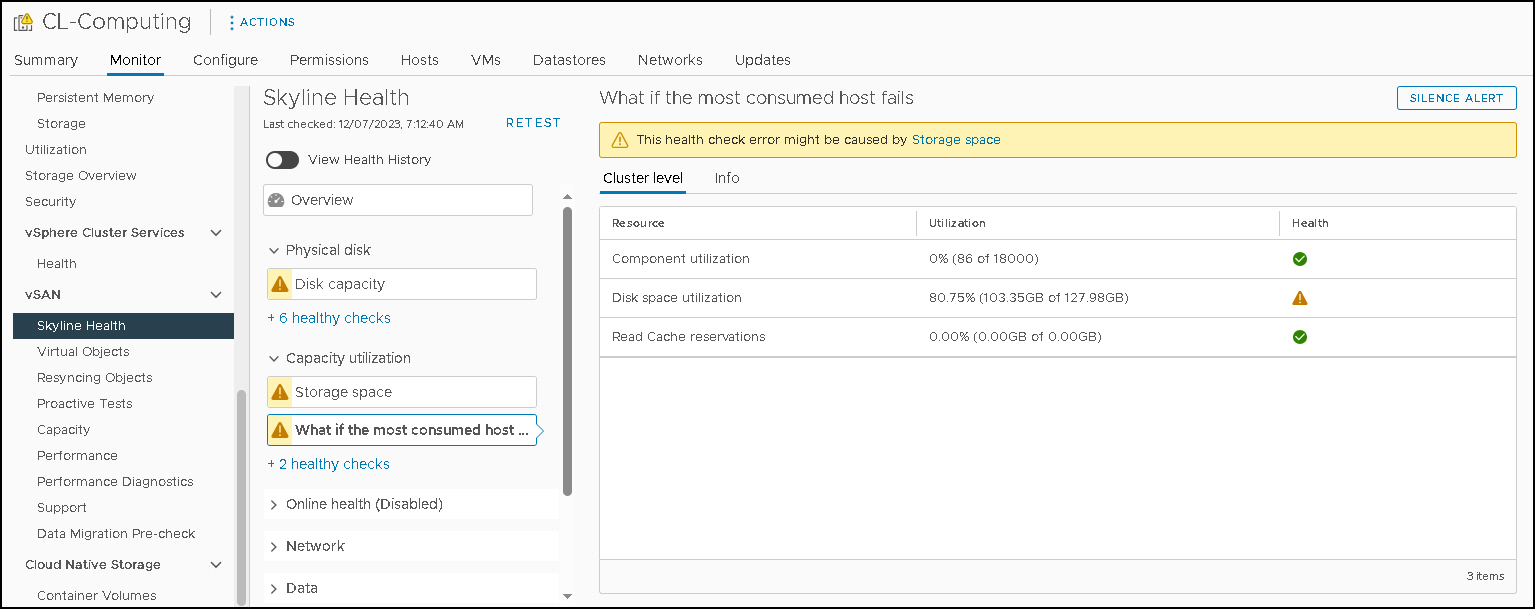 Under the vSAN Skyline Health, for instance, we can see more details of each alarm: